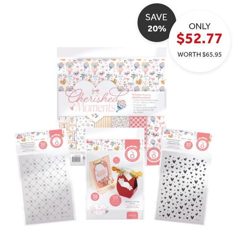 The Cherished Moments collection features romantic embossing folders that add stunning, dimensional hearts and floral lattice design to your crafts.