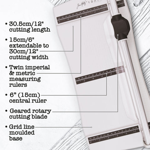 Featuring a geared rotary cutting blade, this trimmer effortlessly cuts through a range of crafting mediums. The trimmer offers both imperial and metric rulers and a handy ¼ inch-gridded base with popular paper sizes for ease of use. With a compact base that has a cutting length of 12.5”/31.5cm and extendable arms that can expand it to 12”/30.5cm, this trimmer is versatile and practical.