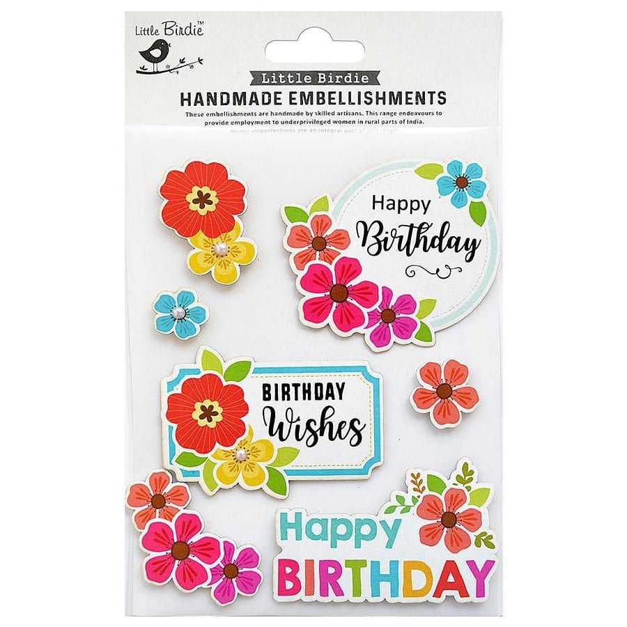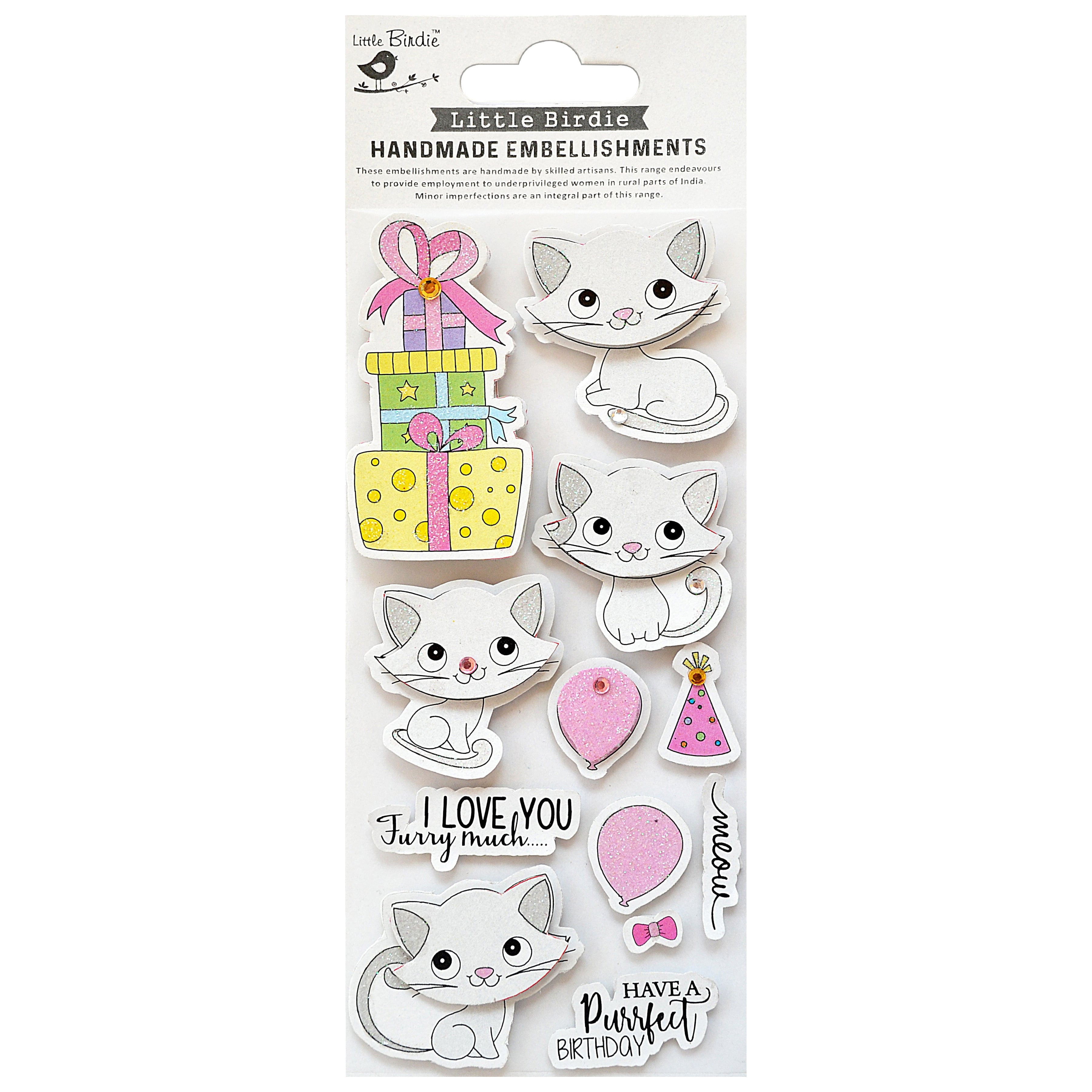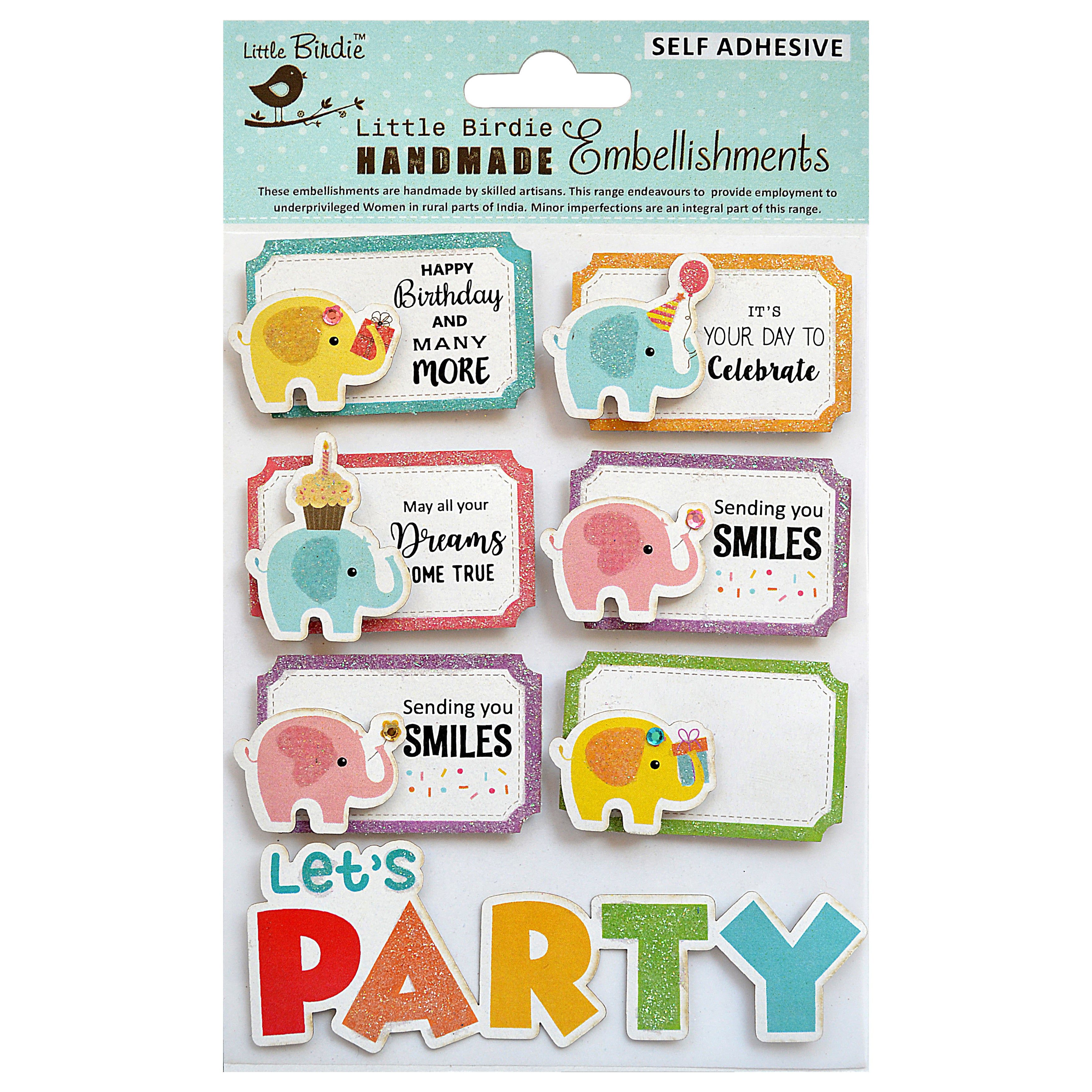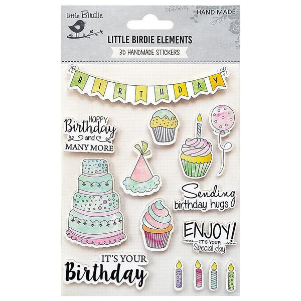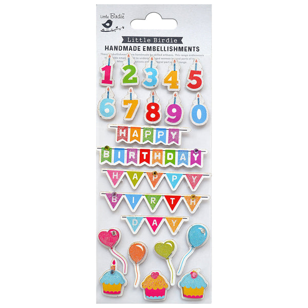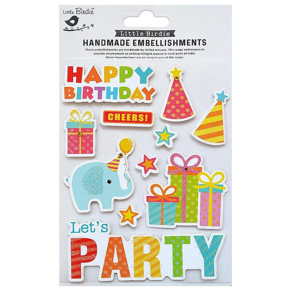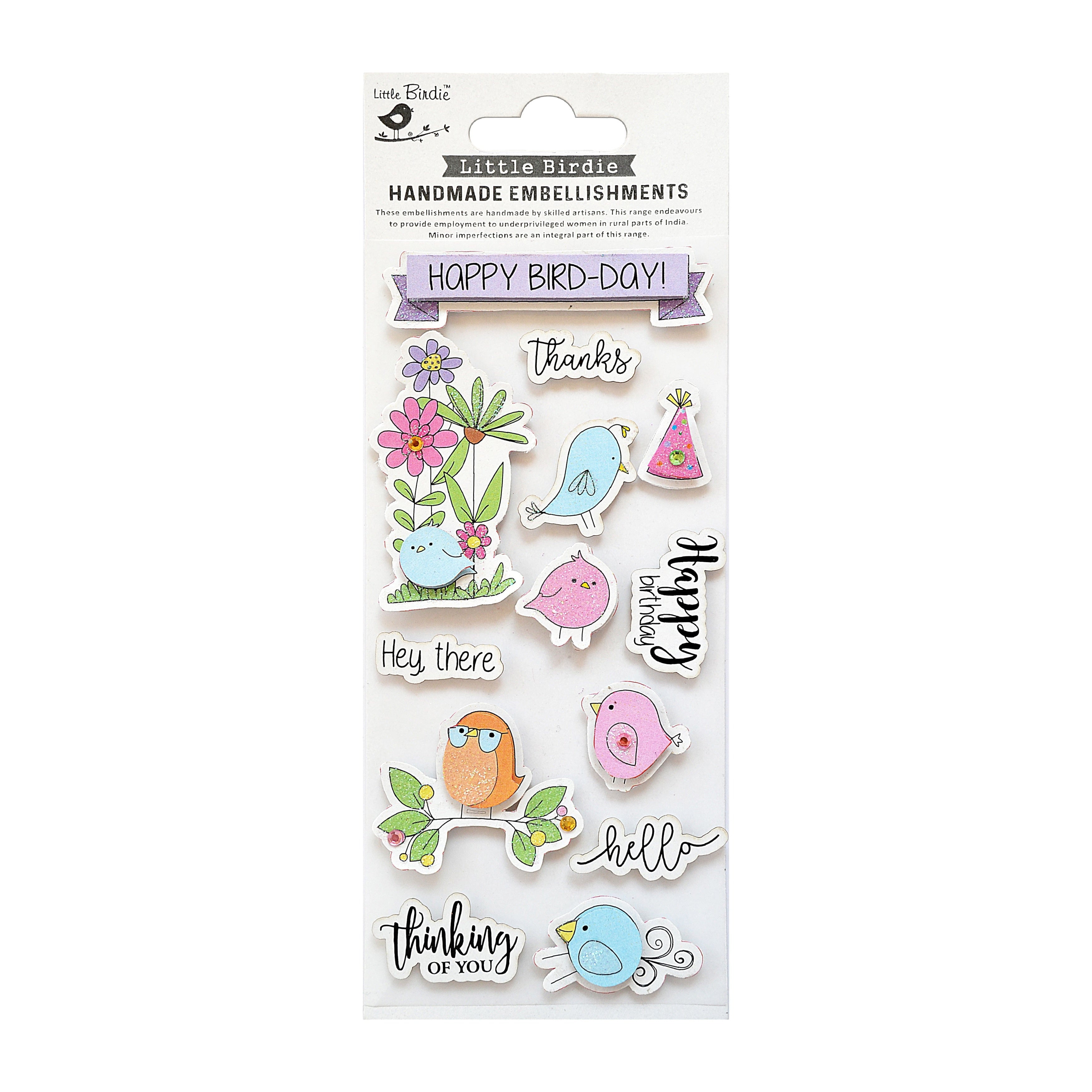 Celebrate with these birthday themed Little Birdie sticker embellishments. Just peel and stick to adhere these colorful birthday party, celebration, and gift embellishments to add beautiful details to your next handmade card or scrapbook page.