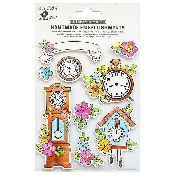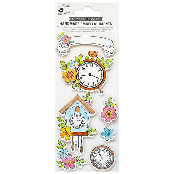 Track the time with these Clock Stickers from Little Birdie. Just peel and stick to adhere these colorful embellishments to handmade cards, scrapbook layouts, home decor, and more.