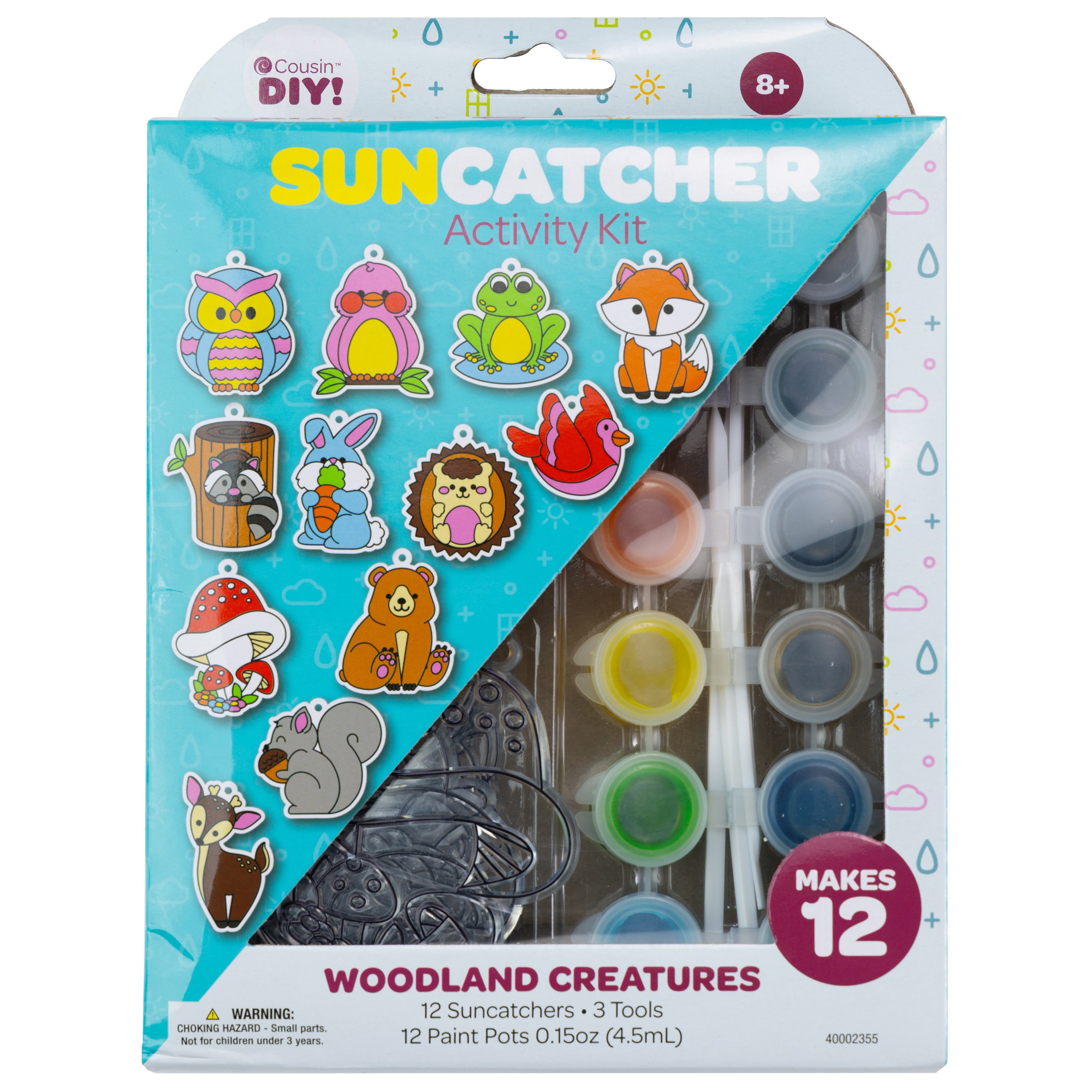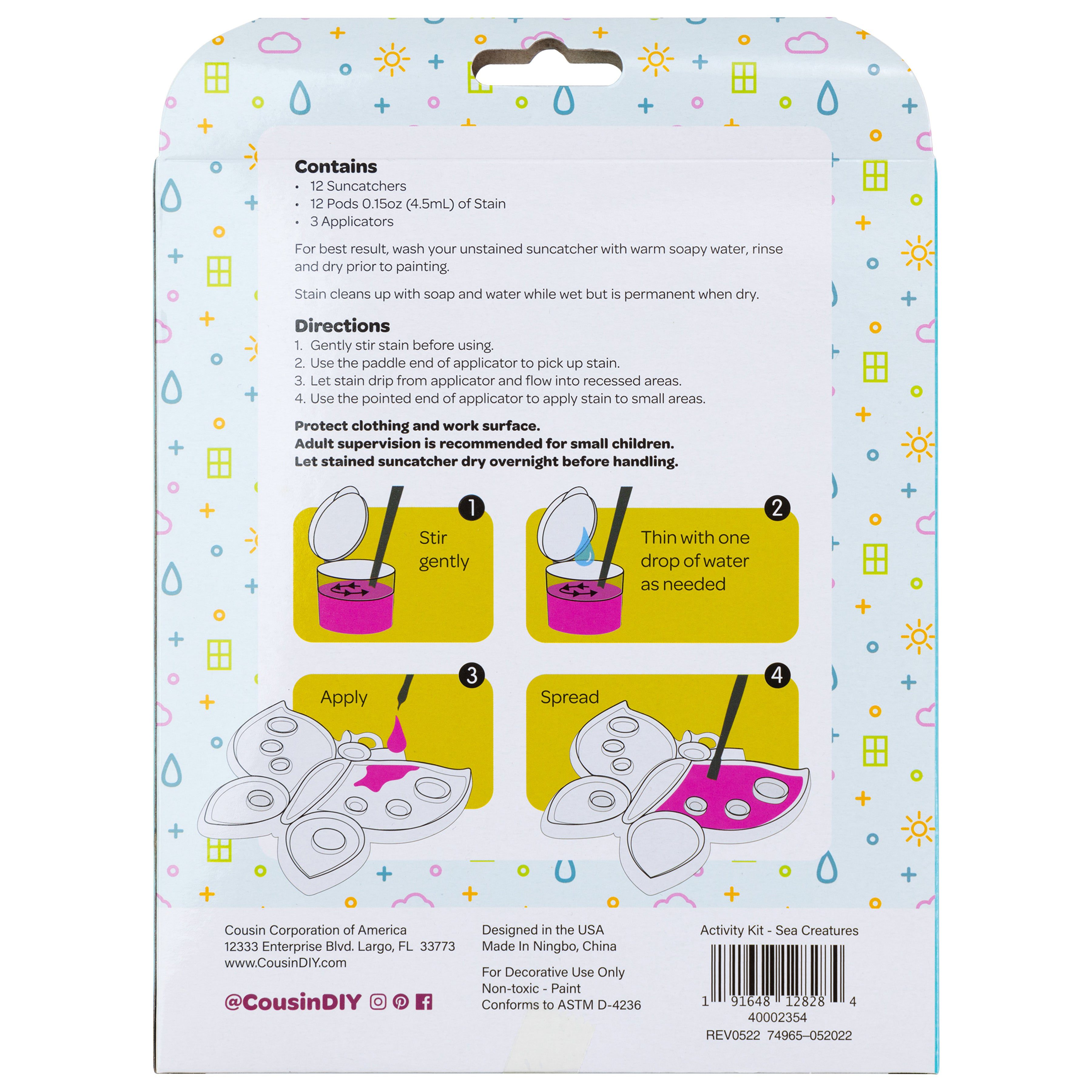 CousinDIY Suncatcher Kits offer a charming way to embrace your creativity! Each package contains the materials needed to create 12 suncatchers: 12 Bases, 12 Pots of stain, and 3 applicators.