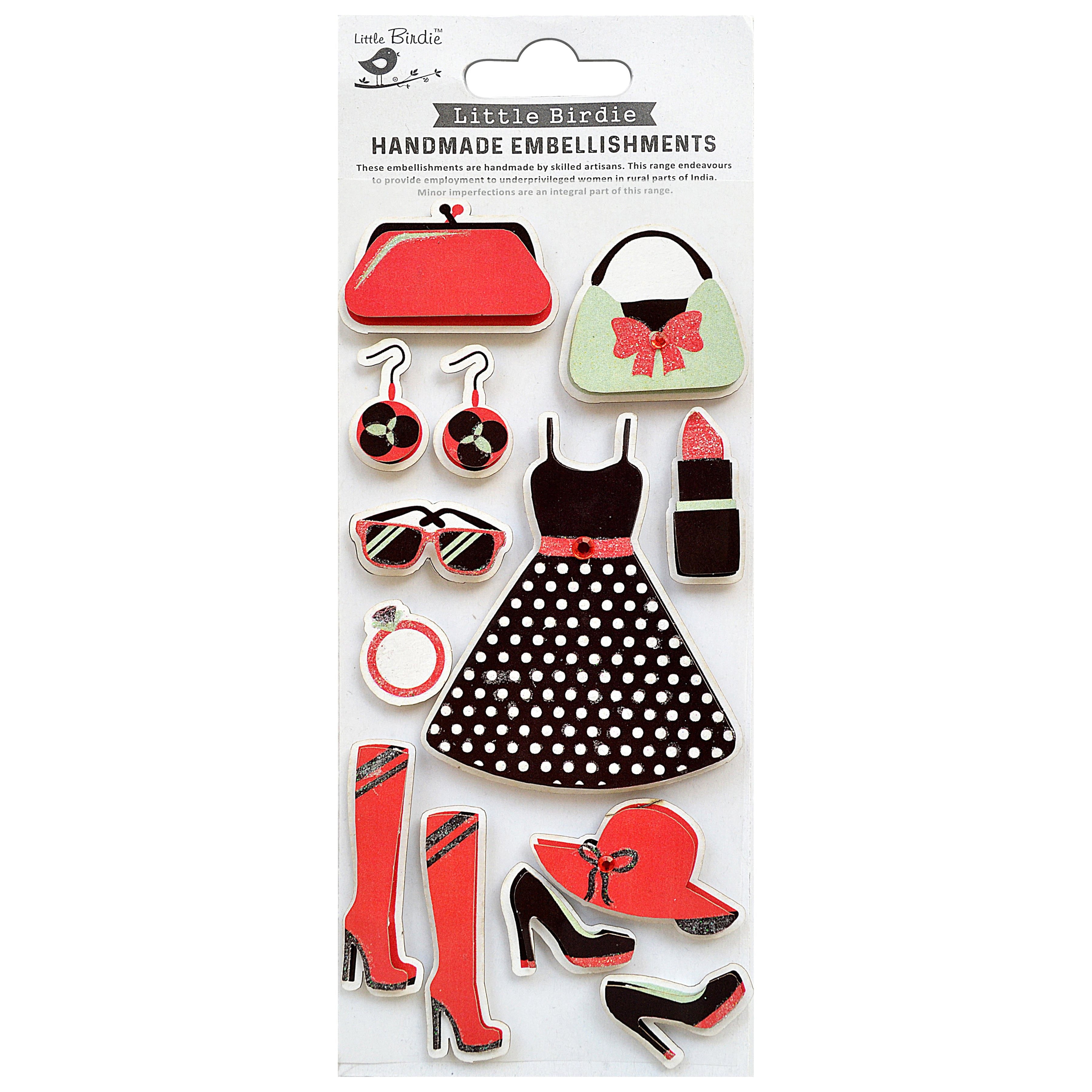 Dress up your handmade cards and crafts with these Clothing Themed Stickers from Little Birdie. Just peel and stick to adhere these fun, colorful embellishments to scrapbook layouts and more.