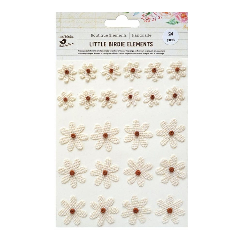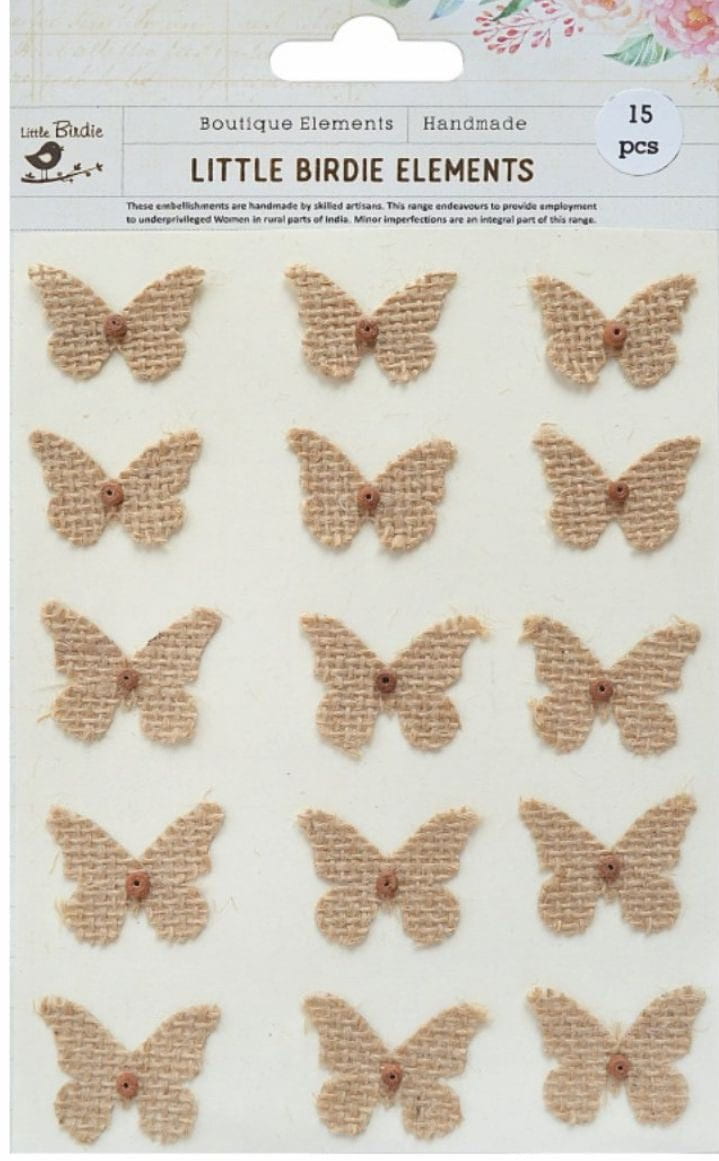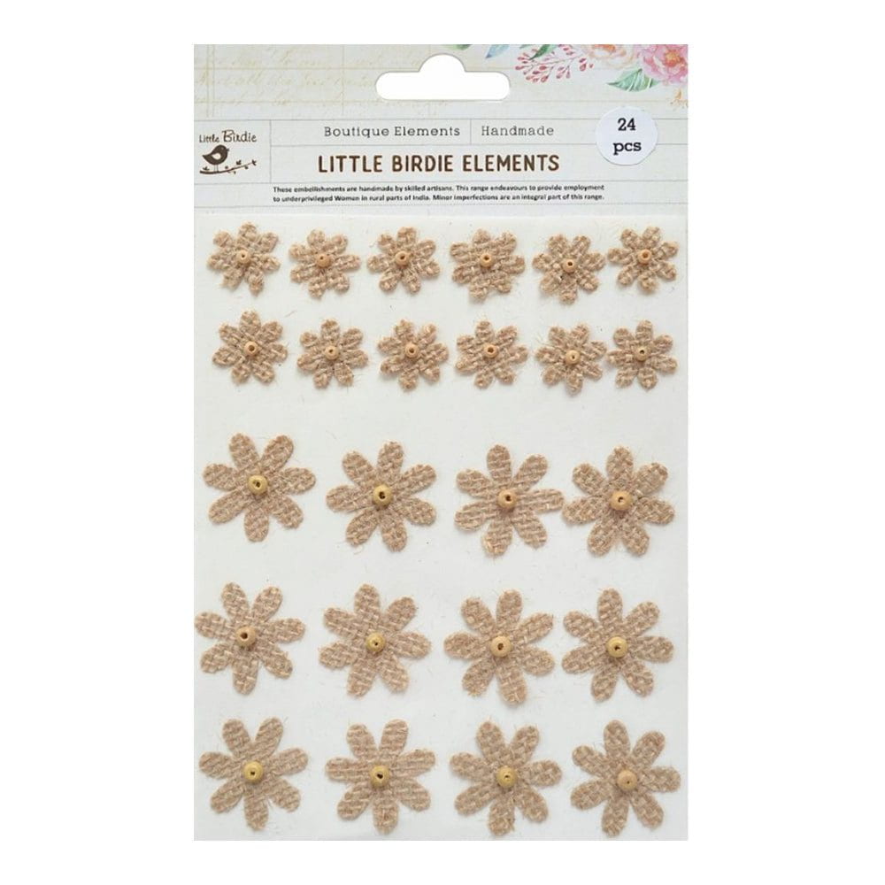 Little Birdie Enchanted Sticker Embellishments are easy to use self-adhesive stickers with beautiful burlap texture and a wooden bead center. Just peel and stick to enhance a scrapbook page, mixed media layout, handmade card, tag, or any paper craft project with these pretty flowers and butterflies.