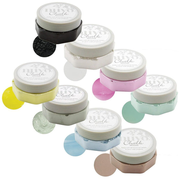 Nuvo Chalk Mousse works well with or without stencils to add a matt textured definition to all your mixed media cards & projects. Nuvo Chalk Mousse is available in a fresh color palette. Distilled water can be added to this water-based product to soften the consistency.