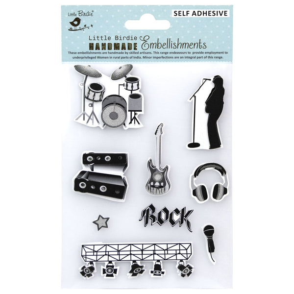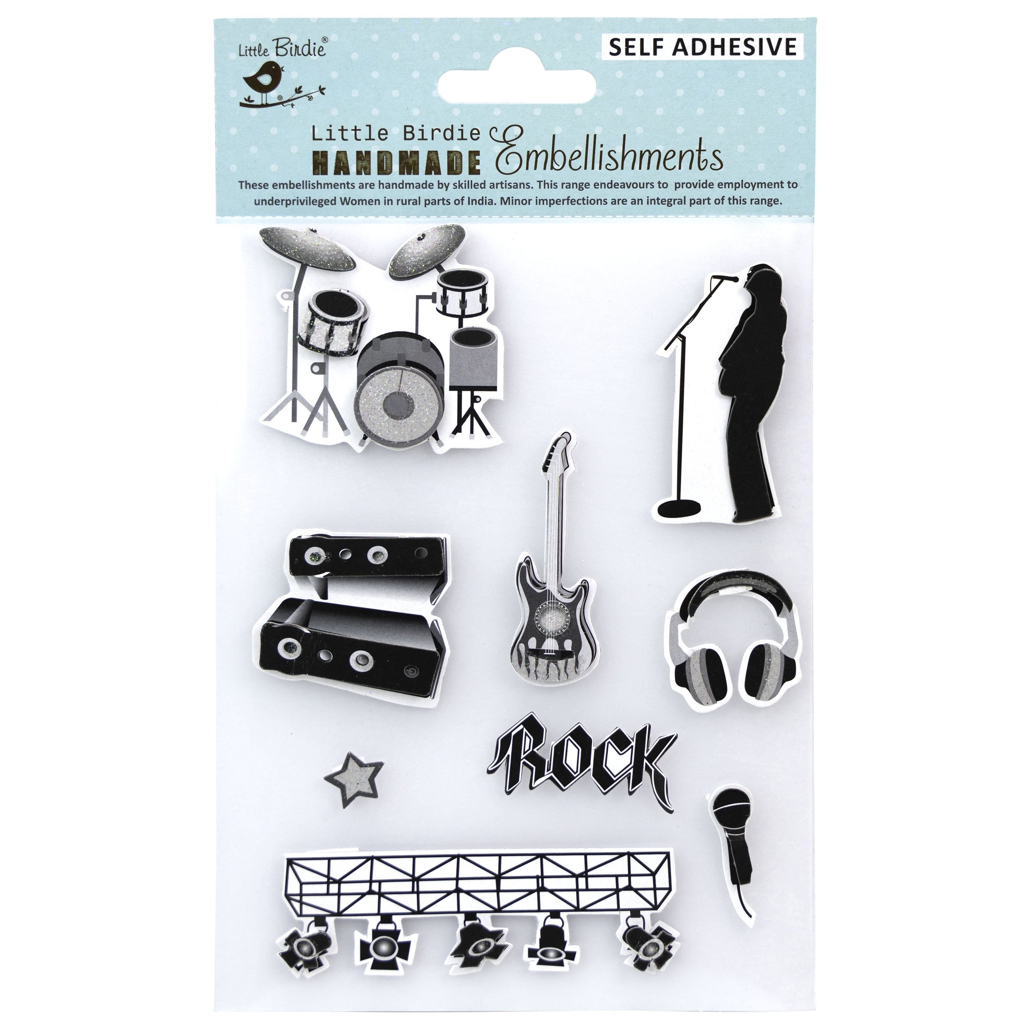 Turn up the volume on your crafts with these Music Themed Little Birdie sticker embellishments. Just peel and stick to adhere these cool embellishments to your next handmade card, home decor project, or scrapbook page.