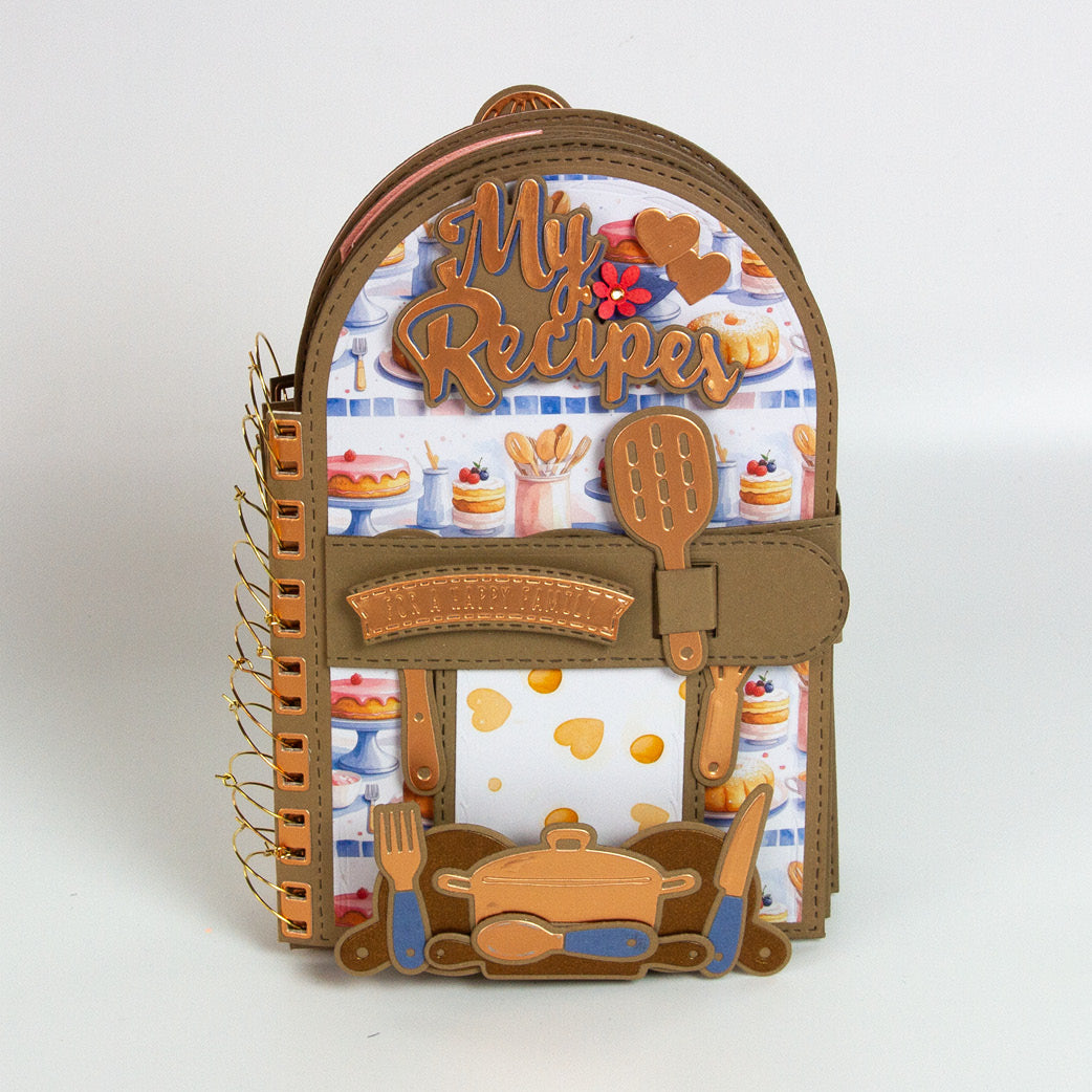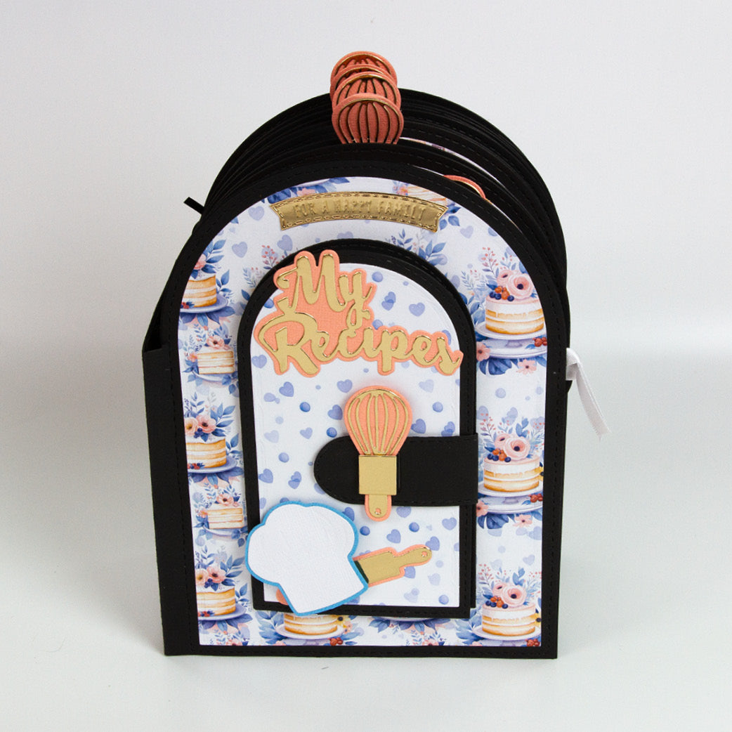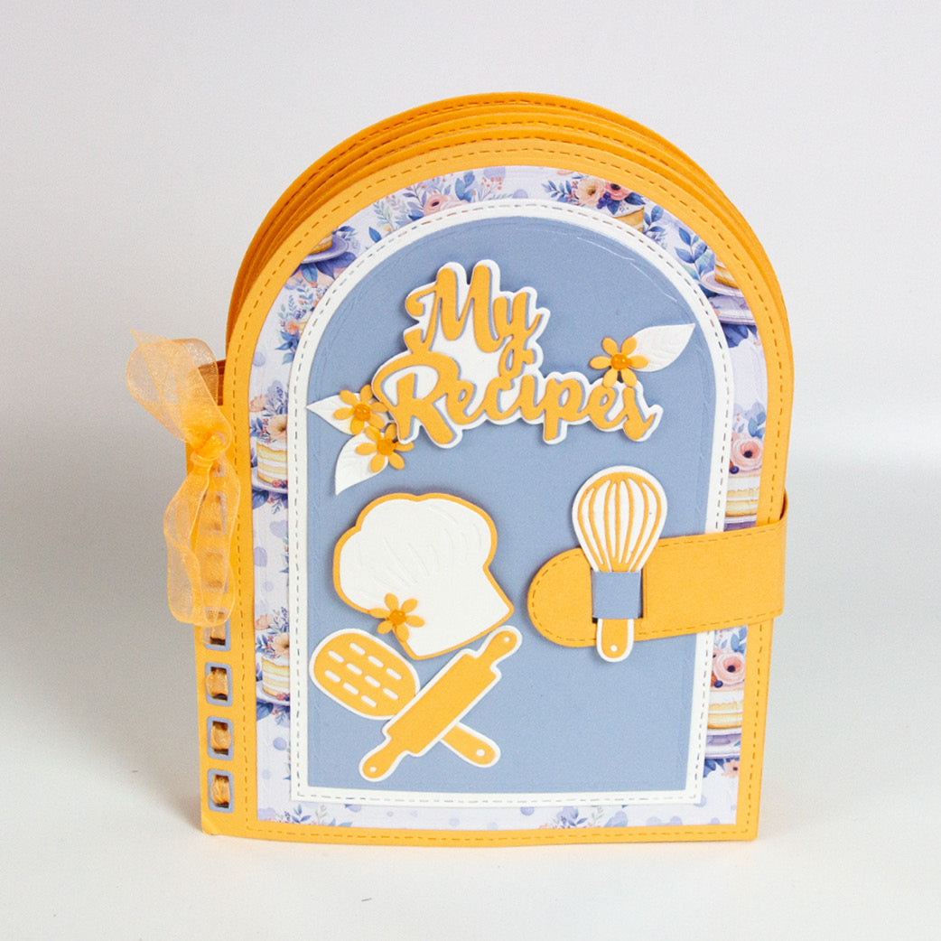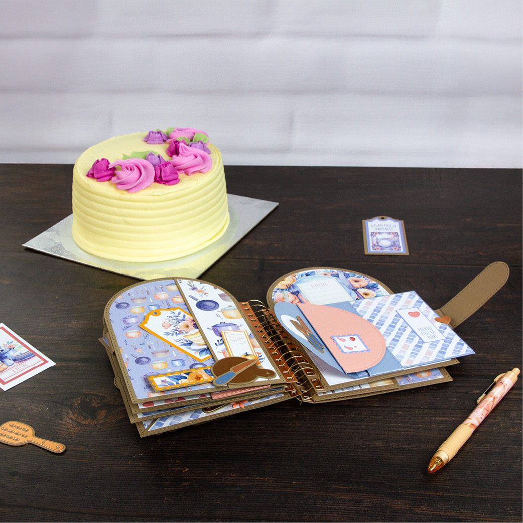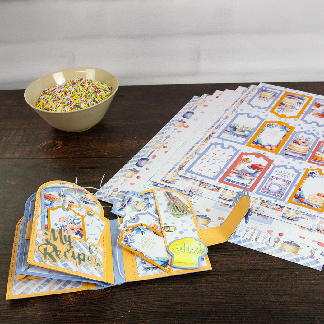 Create three different-sized memory books using the comprehensive 49-piece die set, then decorate your pages with the charming culinary illustrations featured in the premium patterned cardstock pad. Designed in a delightful color palette of orange sorbet, powder blue and marzipan pink, this collection is perfect for bakery-inspired albums, gift books and heartfelt handmade heirlooms.