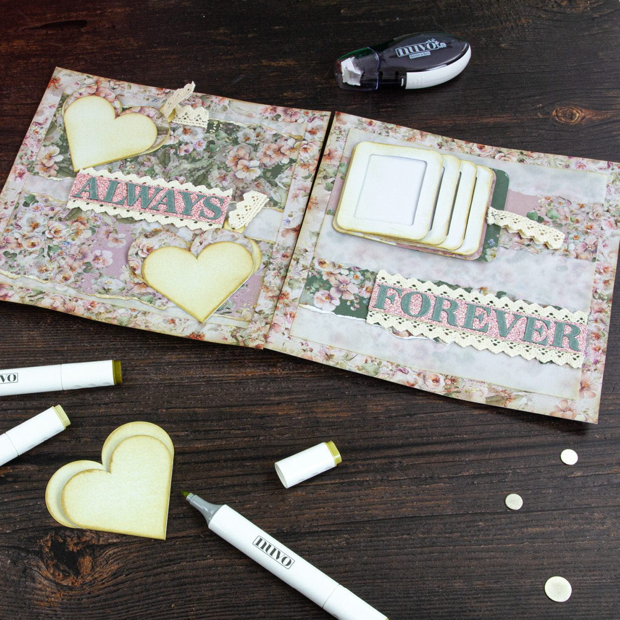 Five beautiful pre-constructed heart-shaped pockets and inserts, ready to hang or glue into your My Memory Books! These thoughtfully designed elements are perfect for storing photos of loved ones, capturing cherished moments, or revealing hidden affectionate messages. Embellish them with decorative elements, color them with your Nuvo consumables, and hang them using ribbon or twine. The perfect way to add quick, eye-catching interactivity to your My Memory Book projects!