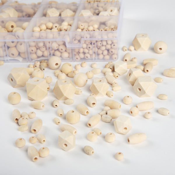 This Unfinished Wood Bead Assortment from CousinDIY includes a variety of geometric, round and oval beads. These natural wood beads feature a beautiful, unfinished light wood tone. This set contains 961 assorted shape and size unfinished wood beads in a sturdy, reusable storage container. Imported.