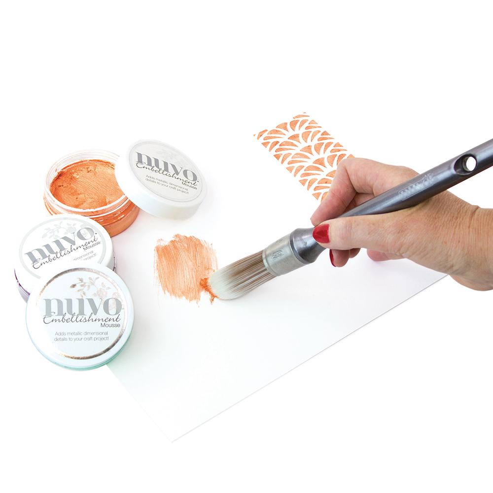 Nuvo Embellishment Mousse is perfect for highlighting your artwork with smooth metallic details provided by the highly-pigmented mica powder. Ideal for use with or without stencils, the Embellishment Mousse adds a unique lustrous shine to your papercraft projects and beyond. This versatile mousse is perfect for gilding your designs or using as a stencil paste. For even more brilliant effects, try watering it down for painting and spritzing.