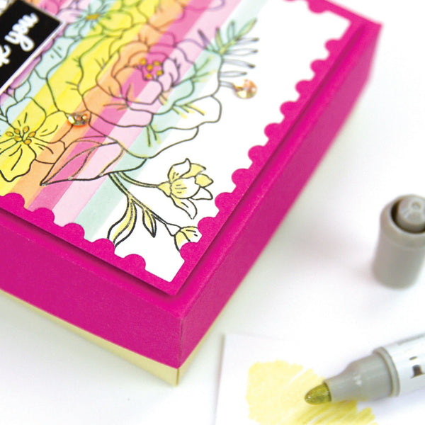 The Nuvo Glitter Marker Pens are the best way to add shimmering highlights to your artwork in beautiful colors. The water-based pens have a broad nib making the pen smooth, sturdy and easy to use. Blend alongside the Nuvo Water Brush Pen to create glittering backdrops and sparkling gradients for a stand-out finish to your work. This pack contains a sparkling yellow shade, Lemon Drizzle. Look out for other colors in the Nuvo Glitter Marker pen range.