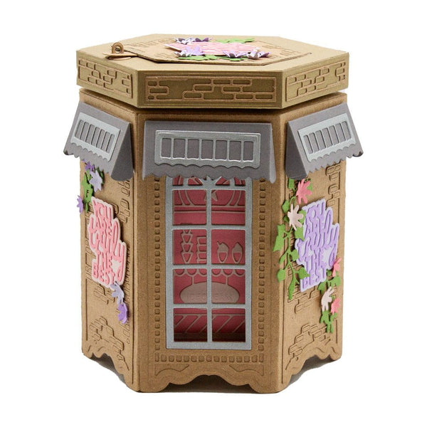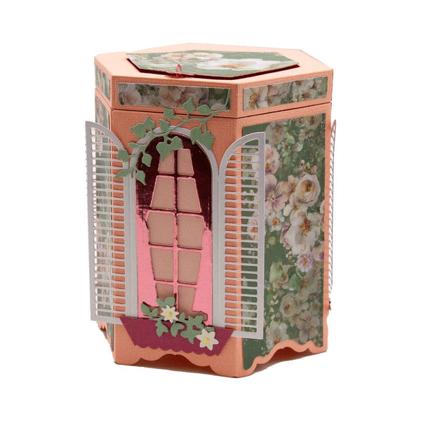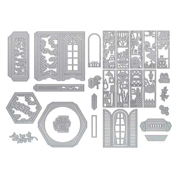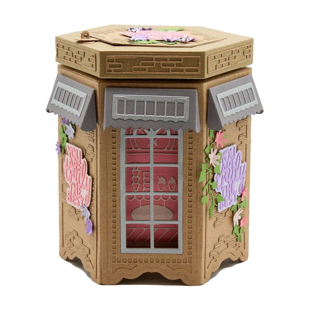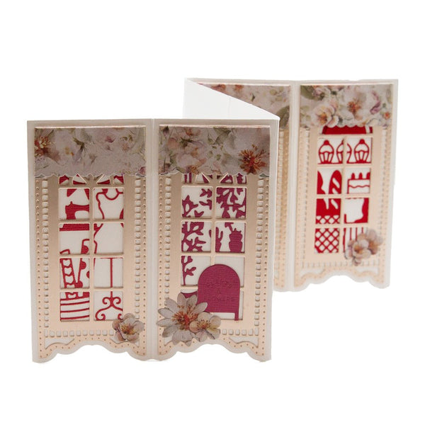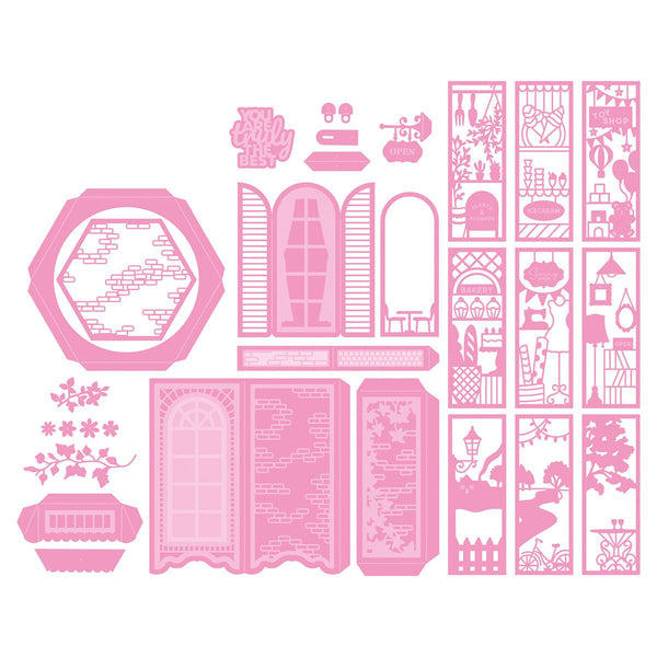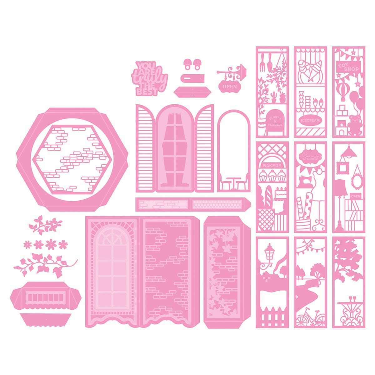 Create stunning shop window-inspired gift boxes with our brand-new Shopping The High Street Spinning Box Die Set. Perfectly sized to hold treats, sweets and gifts, this incredibly versatile die set contains everything you need to make delightful gift boxes. This loveable set features 43 dies, including dies for creating your spinning box along with a variety of gorgeous elements, intricately designed decorative panels, and shop window scenes.