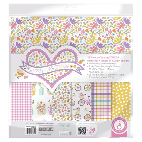 Introducing the Spring Has Sprung 12"x12" Art Pad! This luxurious card pack features stunning imagery inspired by the fresh beauty of spring. The pad includes 2 sets of 9 12" x 12" 200gsm sheets, which are acid-free and double-sided for flawless coordination. Additionally, the pad comes with a sheet of decorative ephemera tags that can be either fussy-cut or die-cut using the Tags and Stamps Die Set (item 5523e), plus a sheet of gorgeous spring stickers!
