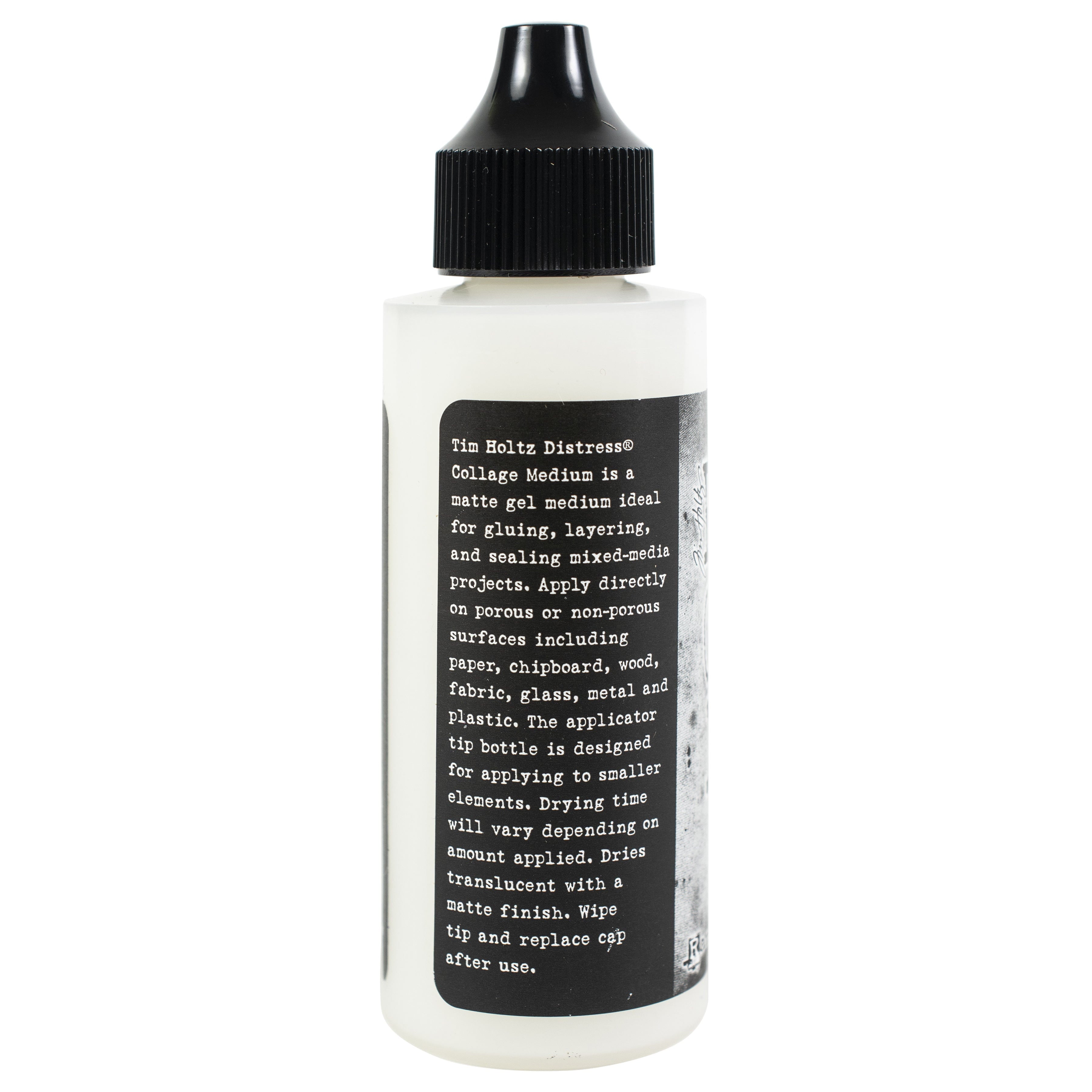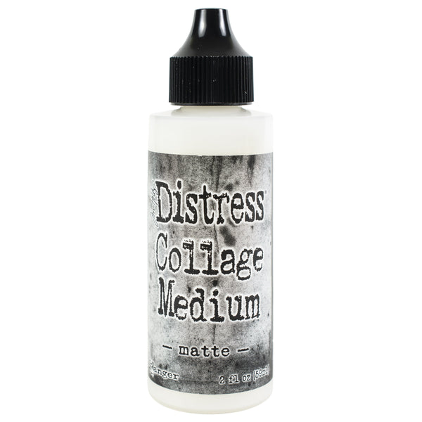 Tim Holtz Distress Collage Medium is a matte gel medium ideal for gluing, layering, and sealing mixed-media projects. Apply directly on porous or non-porous surfaces including paper, chipboard, wood, fabric, glass, metal and plastic. The applicator tip bottle is designed for applying to smaller elements.