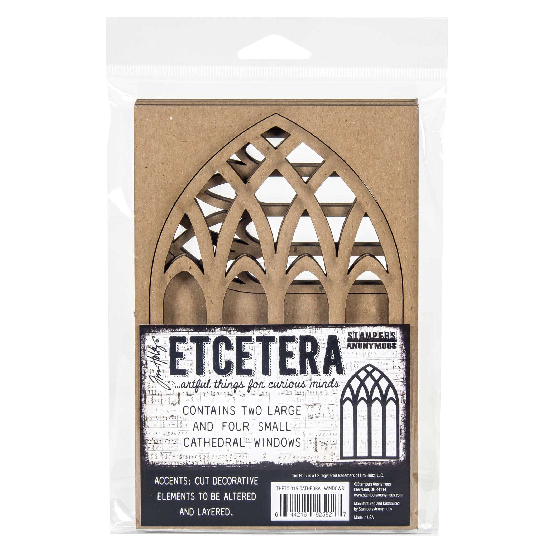 Tim Holtz Etcetera is a line of laser cut creative shapes cut from thickboard that can be collaged, altered and embellished. Each package contains two large (4" x 6.5") windows and four small (2.63" x 4.25") windows, each featuring an arched cathedral shape.