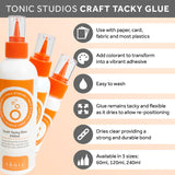 The Tonic Studios Craft Tacky Glue is famed for its reliable adhesion to a variety of surfaces and offers the following features -