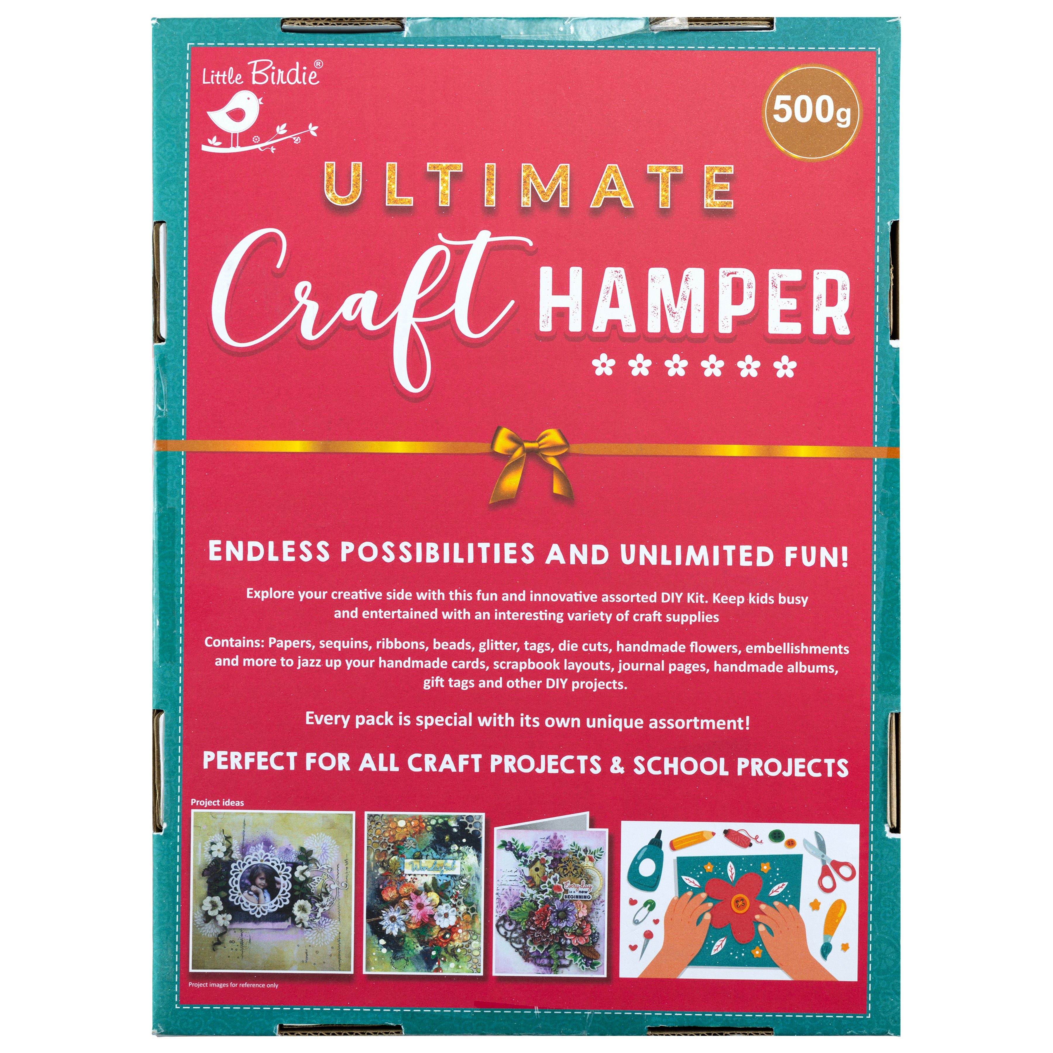Endless possibilities for unlimited fun! Explore your creative side with this fun and innovative DIY kit. Each Ultimate Craft Hamper comes with a different assortment of craft supplies to fuel your creativity. These assorted kits are a fantastic way to jazz up handmade cards, scrapbook layouts, journal pages, handmade albums, gift tags, DIY decor and so much more.