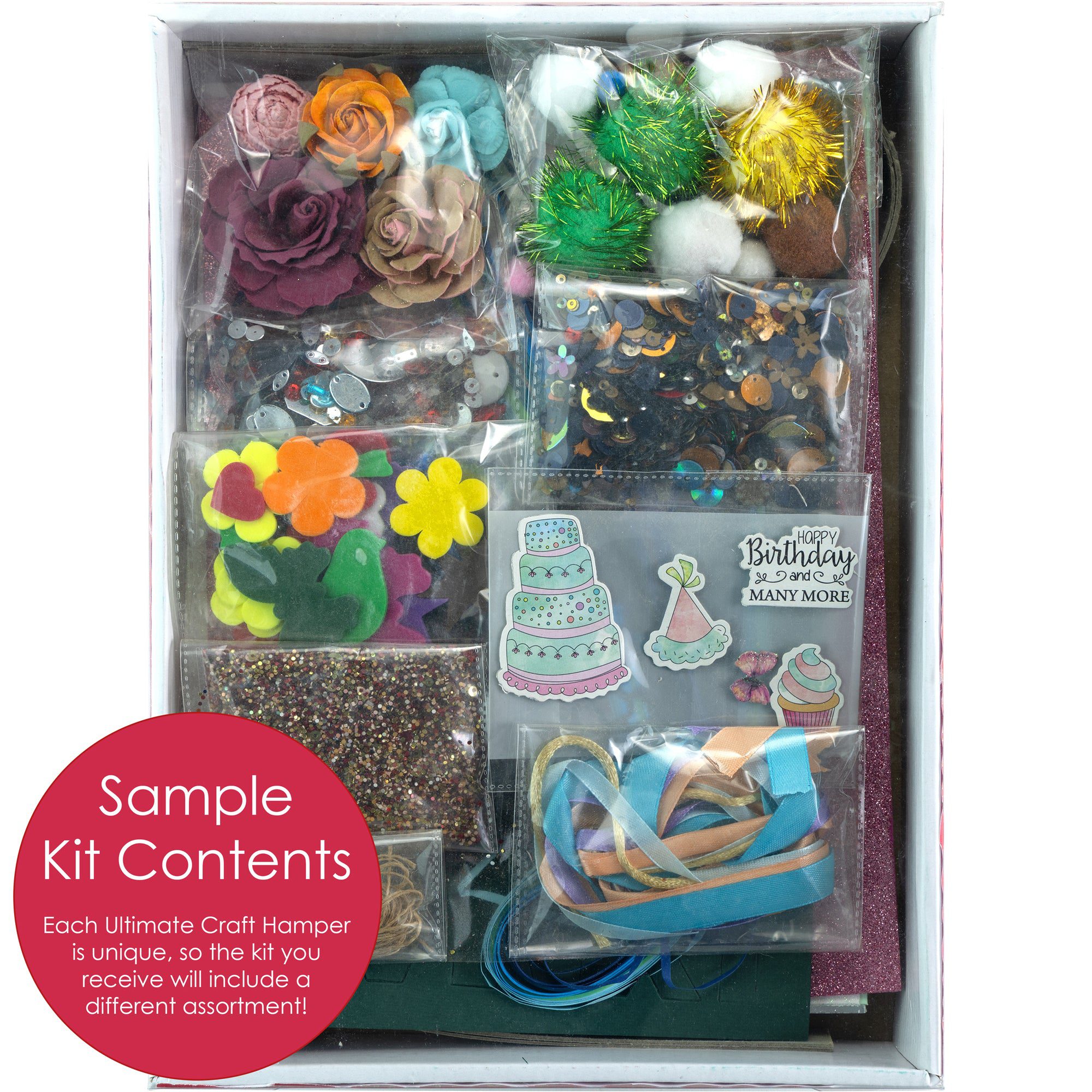 Your Ultimate Craft Hamper will contain 500g of assorted craft supplies. Contents may include papers, sequins, ribbons, beads, glitter, tags, die cuts, handmade flowers, embellishments, and more.
